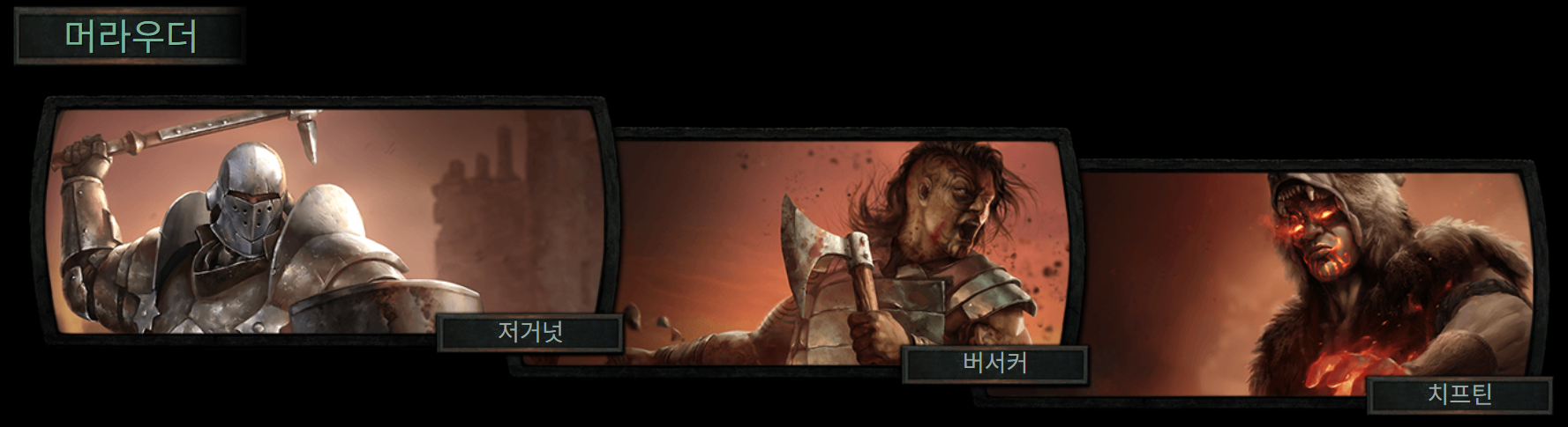 전형적인 [ 힘 ] 케릭. 약탈자 또는 습격자라고 인식 할 수 있는데, 주로 힘, 체력, 근접피해 위주로 구성되는 스킬 트리를 가져 간다.